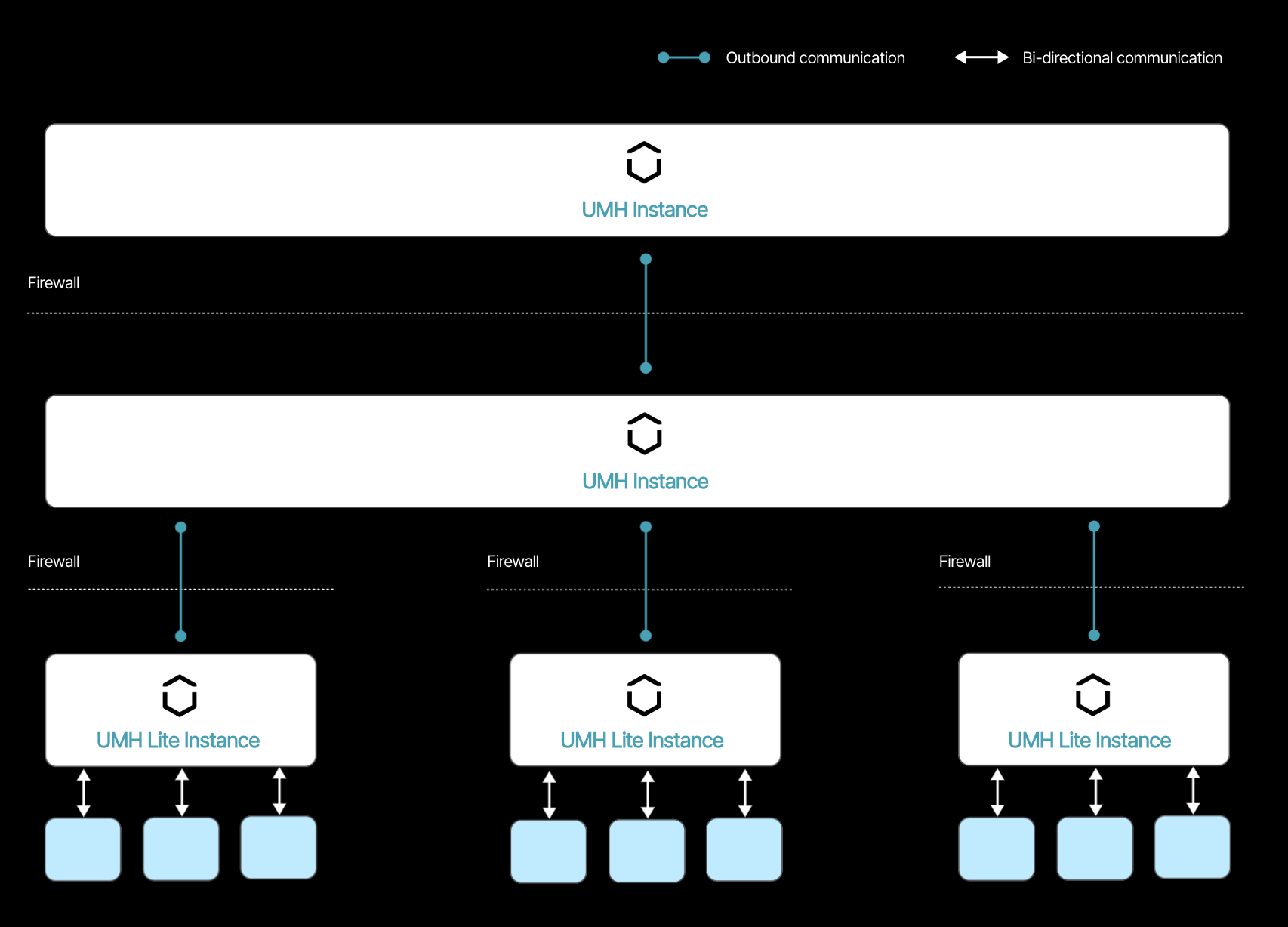 The image below shows that the UMH stack is designed as a distributed system. At the bottom, individual UMH Lite instances collect data directly from the machines. These instances then communicate this data upward with only a single outgoing connection to the central UMH instance of the plant. This data is "saved" intermittently in the message broker which prevents in case the connection between a UMH Lite instance and the central UMH instance goes down. When one UMH Lite instance goes down, the others keep working. Optionally, another central UMH instance in the cloud could collect data from the individual central UMH instances at each plant. This approach ensures that only one connection from the shop floor should be white-listed in the firewall.