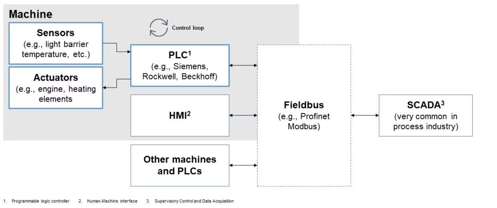 The individual control loops are connected via a fieldbus along with other components such as Human Machine Interfaces (HMI) and other machines. Here the parallel with IT is drawn: this combining of multiple individual systems over a real-time common interface can be likened to a distributed system.