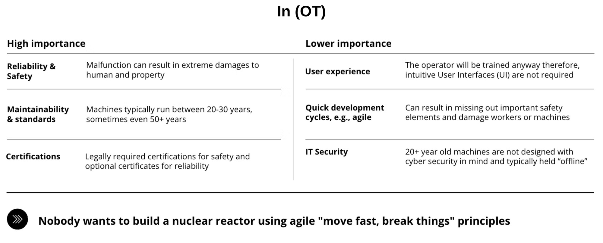 OT places a low importance on user experience because operators are trained and required to use the provided tools, so a "pretty" interface is not required. Quick development cycles are unwanted: nobody wants to build a nuclear reactor using agile "move fast, break things" principles. Finally, OT systems traditionally have little to no concern for IT security because they are typically not connected to an outside network.