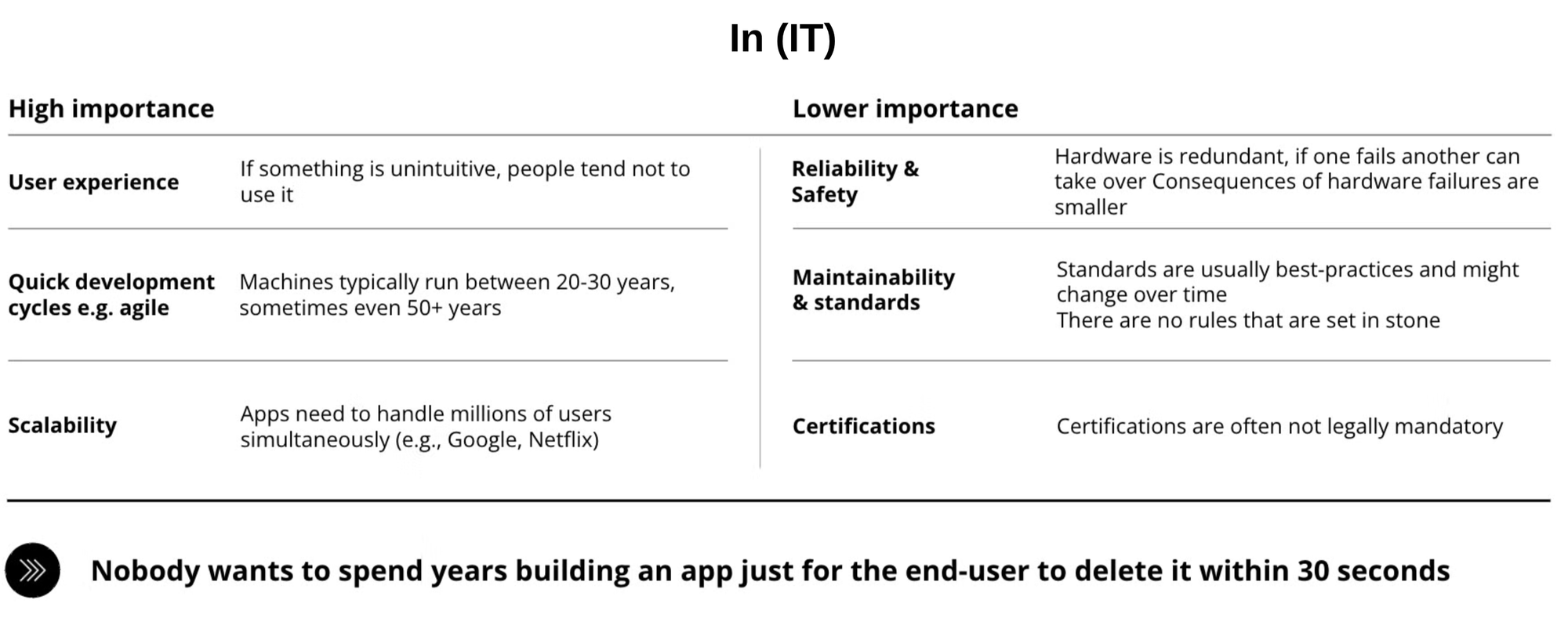 Unlike OT, IT places a high importance on a good user experience. If the solution is unintuitive, people won't use it. Quick development cycles are important as users require frequent changes fast. Finally, scalability can be important when apps need to handle millions of users, e.g. Netflix.