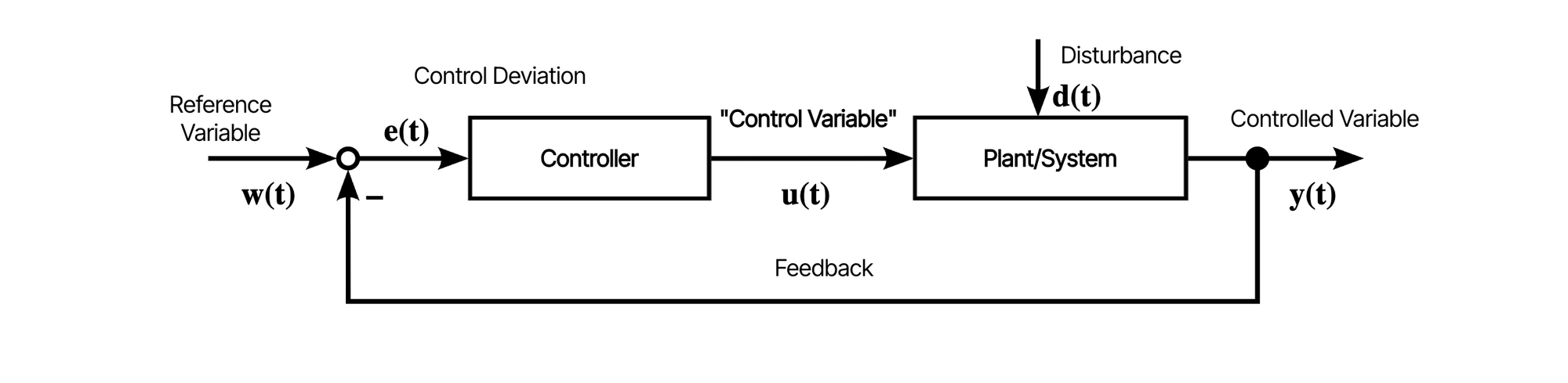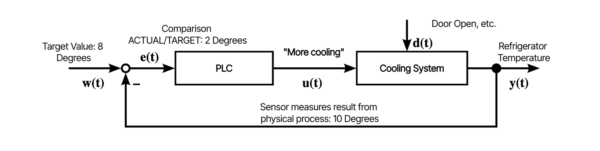 Now, a simple example of a control loop temperature control system of a fridge: In the image below, there's a controller and a cooling system. A temperature sensor measures the current temperature. This measured output is compared to a reference and the measured error is communicated to the controller. The controller then executes its control algorithm and calculates the input for the system. The sensor re-measures the system output and the cycle repeats itself.