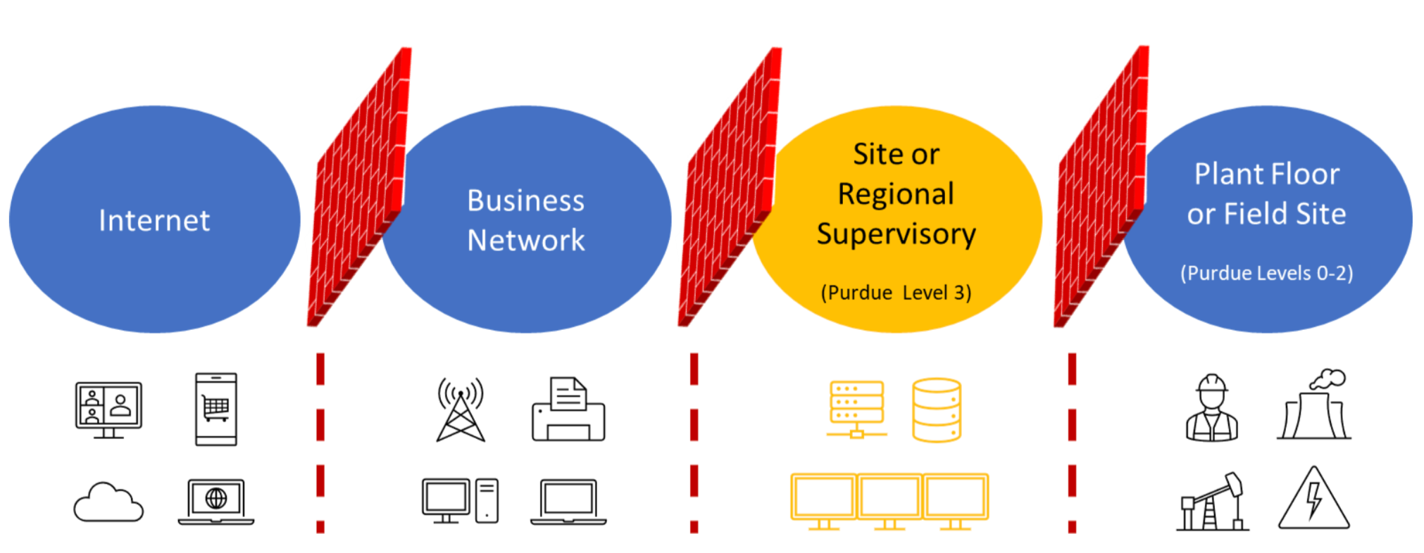 To counter this, the traditional solution in OT is to set up one or in the Purdue Enterprise Reference Architecture (PERA) even multiple demilitarized zones separated by firewalls. In the image below, the various layers of the automation pyramid (also called Purdue model) are separated by such firewalls. Unfortunately, these barriers make connecting the lower levels to the cloud much more difficult, often requiring multiple jump hosts, VPNs, or sometimes a combination of both. Therefore, it is made practically impossible to connect there, and usually OT engineers prefer a physical connection on the the factory floor itself.