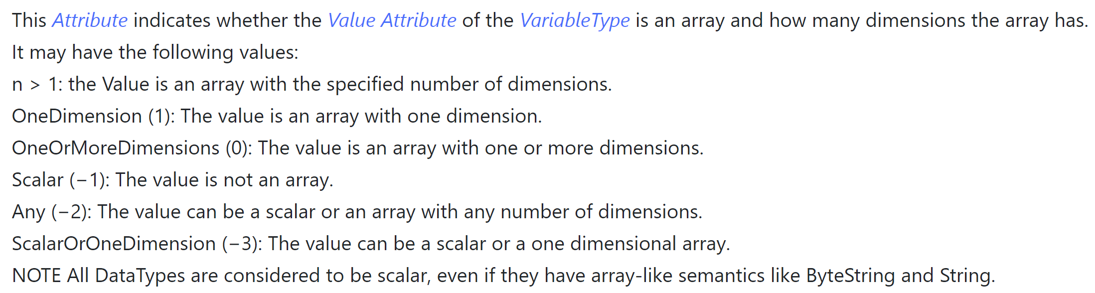 The complexity escalates with the introduction of arrays derived from these base types—an understandable feature. Yet, the complexity begins here. The "ValueRank" of a variable can be set to various levels, from "scalar (-1)" indicating no array, to higher numbers specifying the array's dimensionality. The system also allows for ambiguity with settings like 0 (undefined dimensions), -2 (variable or array of any dimension), or -3 (variable or one-dimensional array).