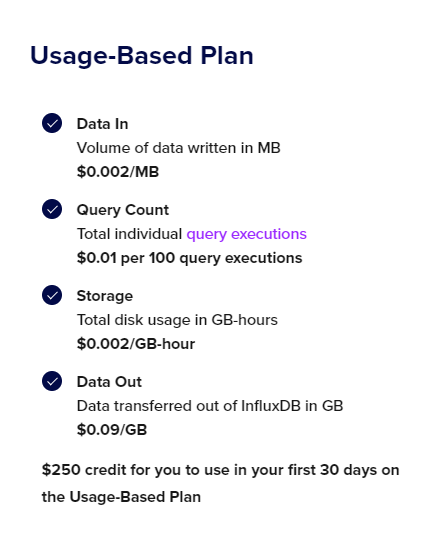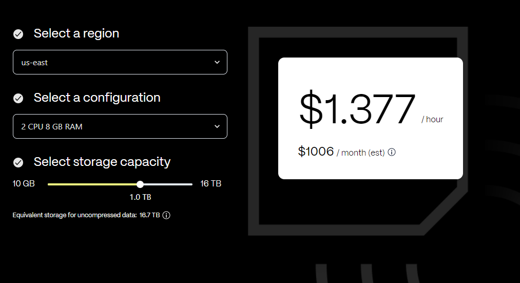 InfluxDB points out that the Dedicated solution is more directly comparable in this context, although pricing information isn't publicly disclosed. The Serverless solution, while having a transparent pricing structure, tends to be considerably pricier compared to TimescaleDB (refer to the screenshot later in the post). The initial cost to store data (~12TB) is a one-time fee of 24k USD, followed by a monthly storage fee of approximately 17k USD.