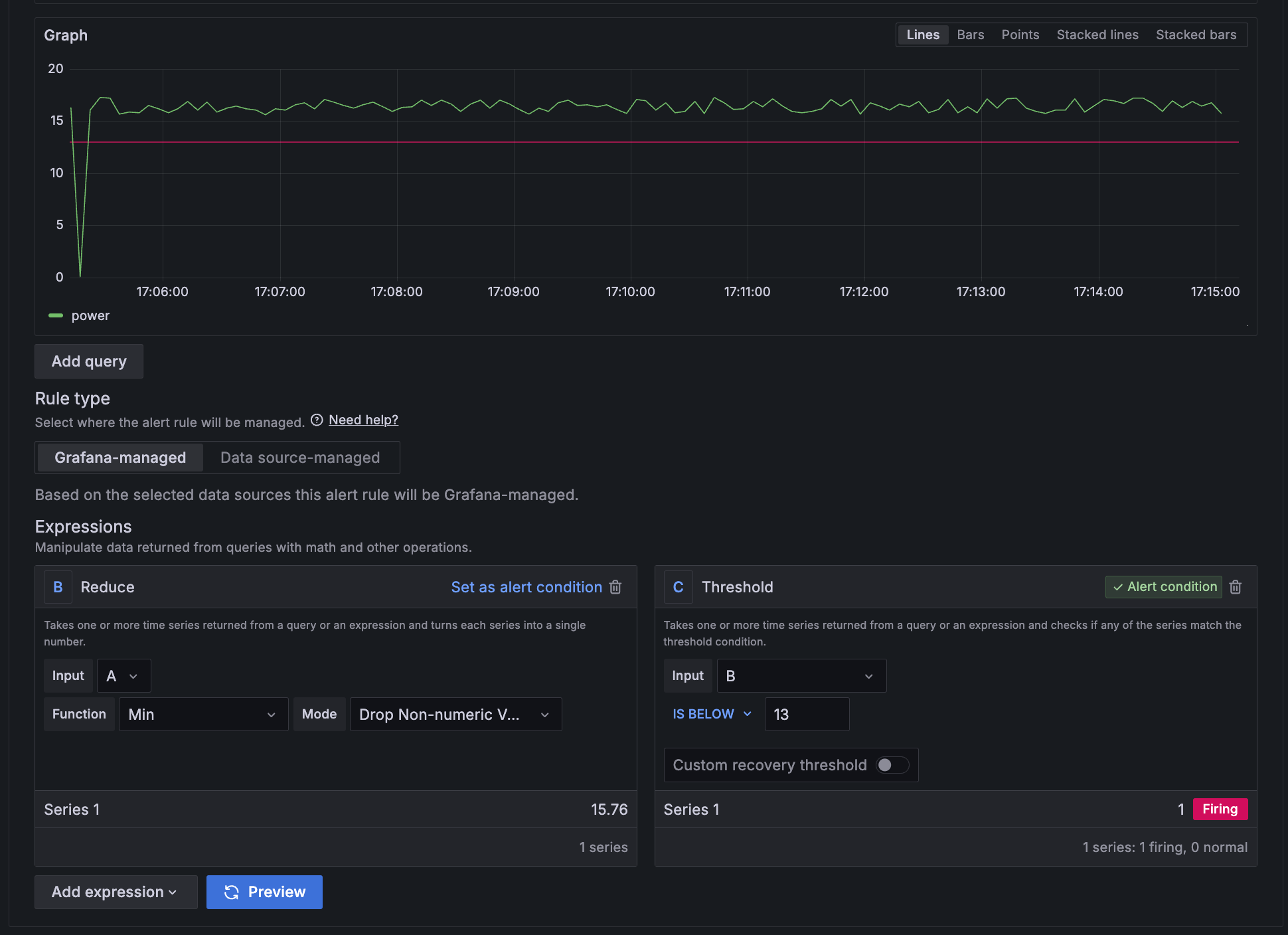In our example, we set the threshold (which is our alert condition) at 13. As soon as the process value drops below 13, the alert is triggered. You can use the “Preview” button to verify that the alert behaves as expected.