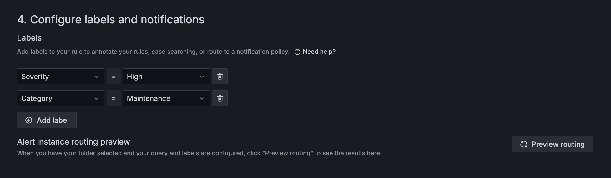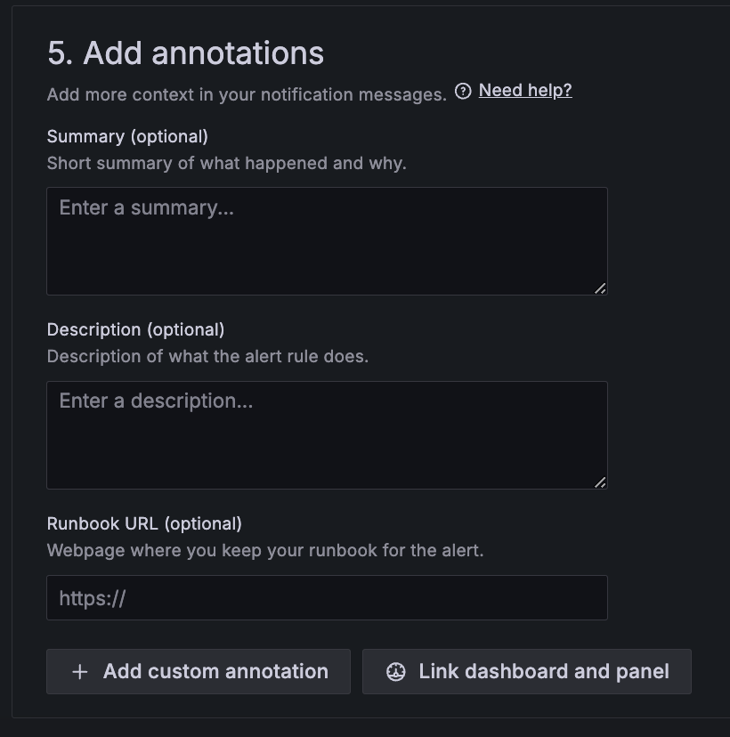 Add annotations and alert messages with simple descriptions, dynamic references to labels (e.g. {{ $labels.severity }}; https://grafana.com/docs/grafana/latest/alerting/alerting-rules/templates/), values and URLs to e.g., SOPs or third party systems.