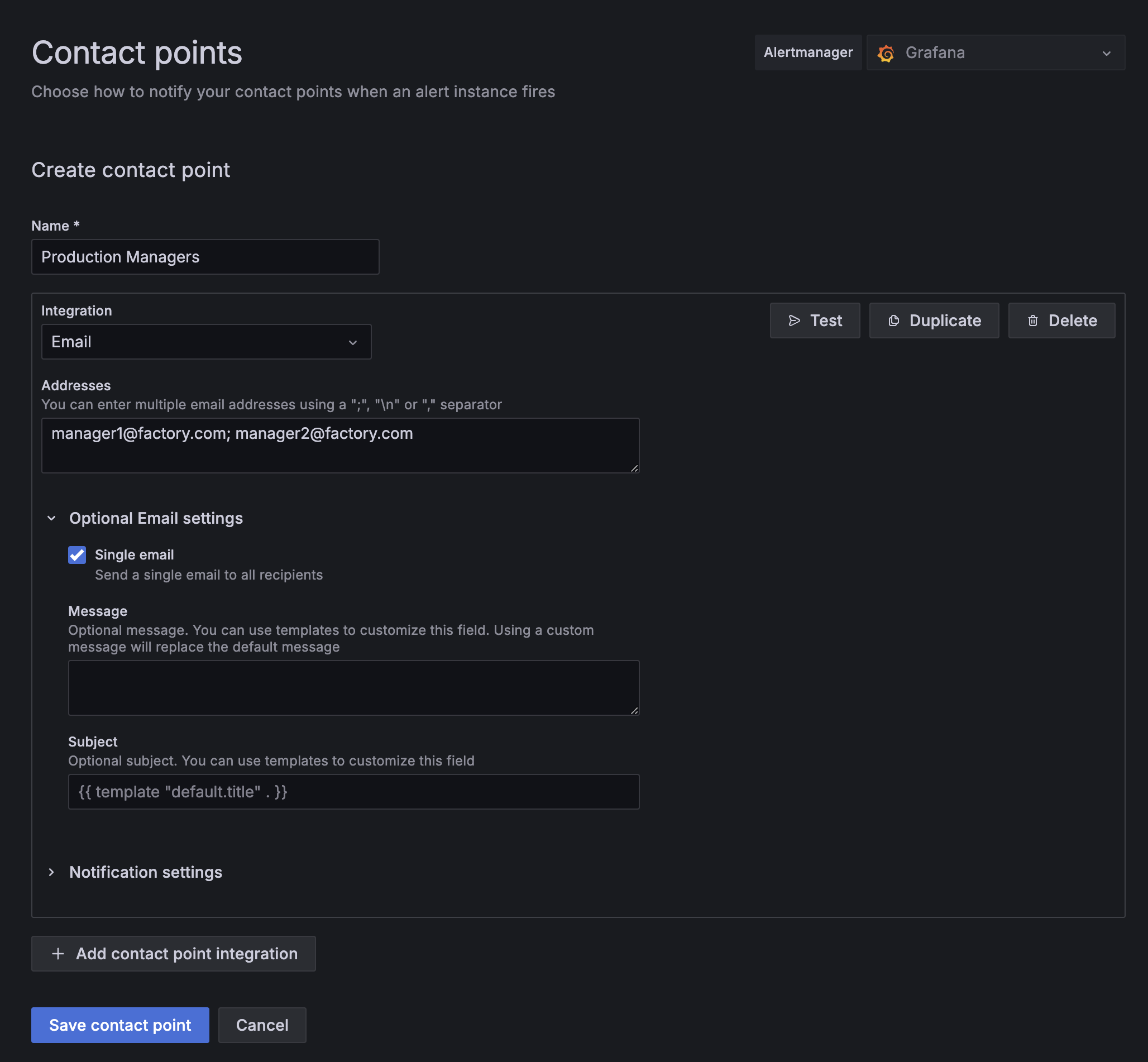 Under Alerting → Contact Points, you can create or edit the channels where notifications should be sent. Grafana supports email, MS Teams, Slack, webhooks, etc.