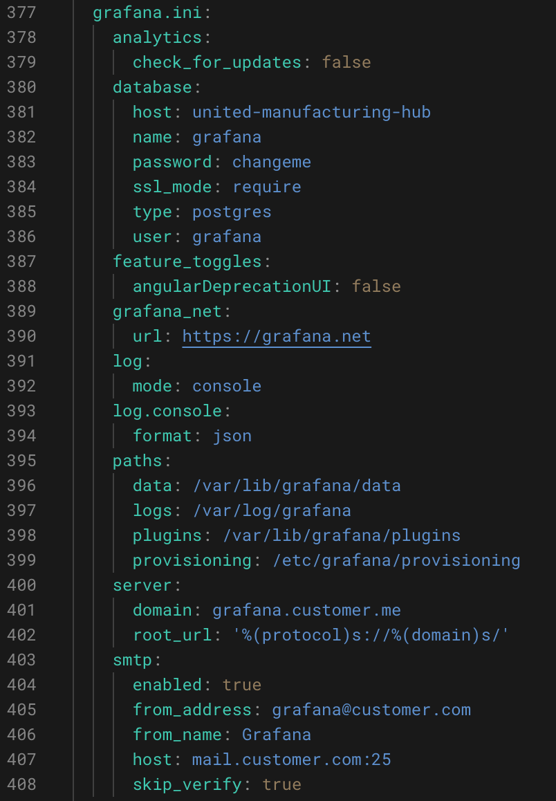 To enable Grafana to send emails an SMTP server credentials are required. These details can be added into grafana.ini configuration file. Best way is to update the HELM chart in the value.yaml (https://umh.docs.umh.app/docs/reference/helm-chart/#dz-grafana). This can be done with OpenLens under “Releases”. After upgrading and restarting the container testing the notification over the “Test” button will work. (soon to be integrated in the Management Console)