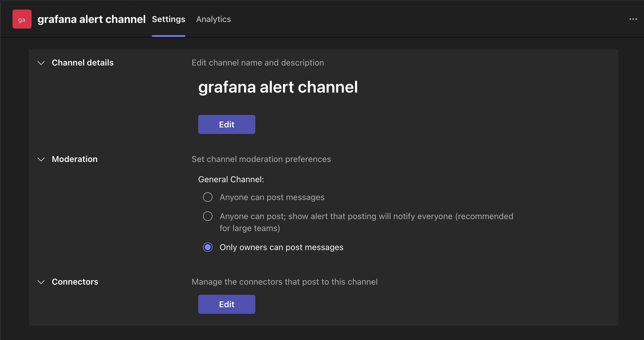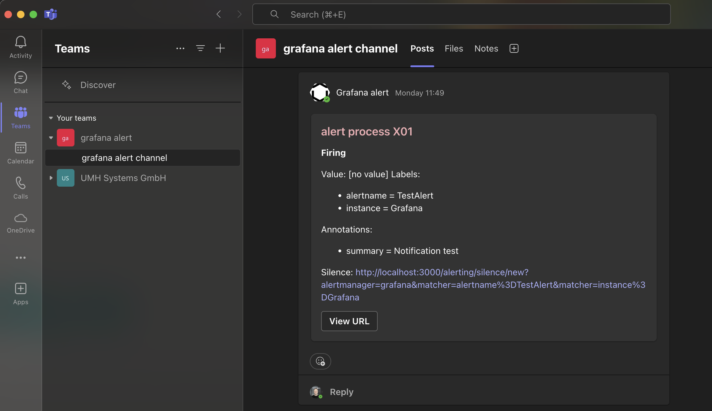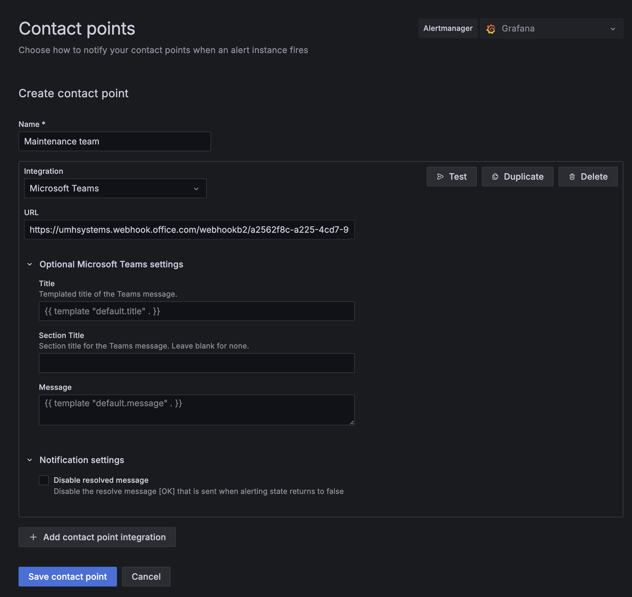 In Grafana, create a new contact point, choose “Microsoft Teams” as the Integration, and paste the webhook URL. Done.