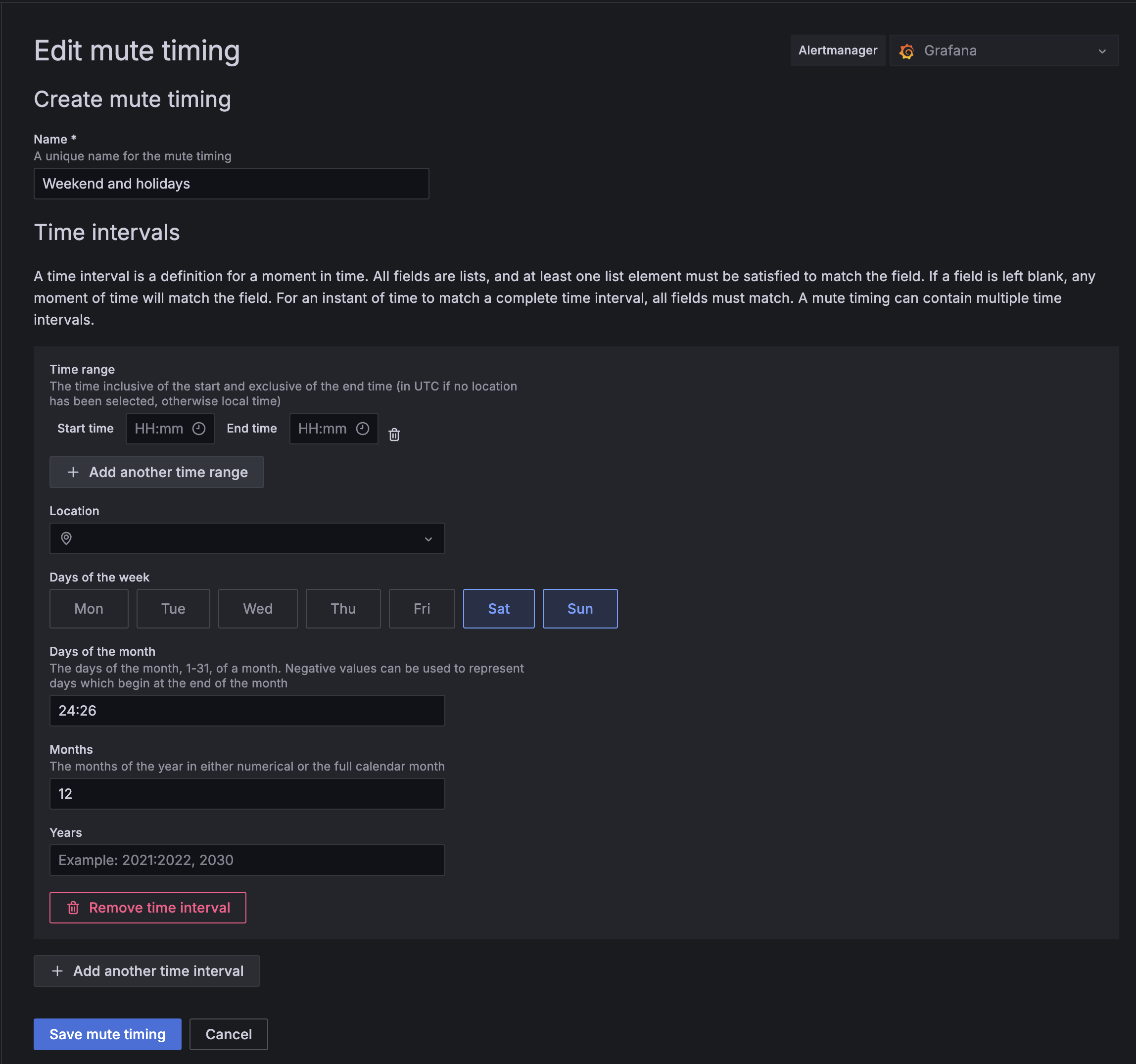 The mute timings need to be set up separately and are meant to define timeframes where notifications are turned off. E.g., on weekends and during holidays.