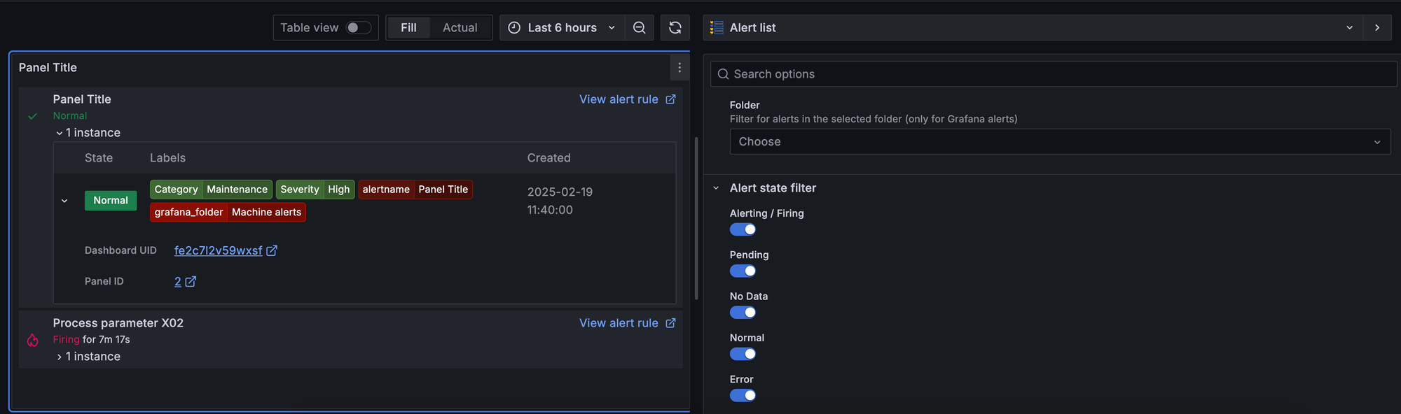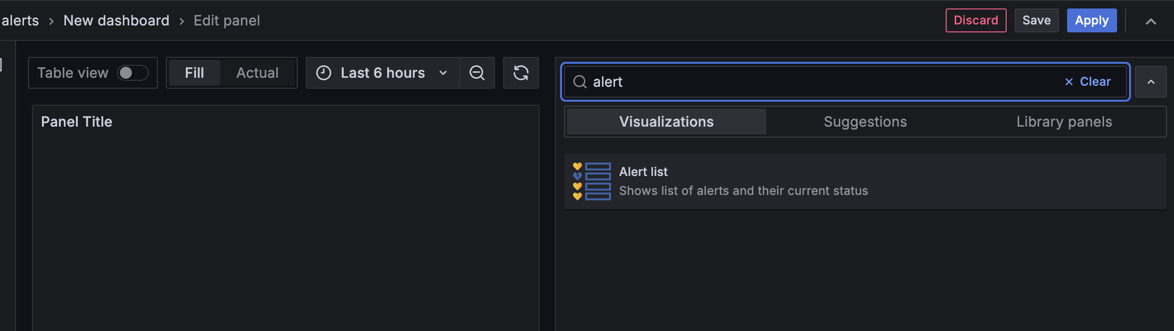 - create a new panel in a dashboard and select “Alert list” from the widget drop down.