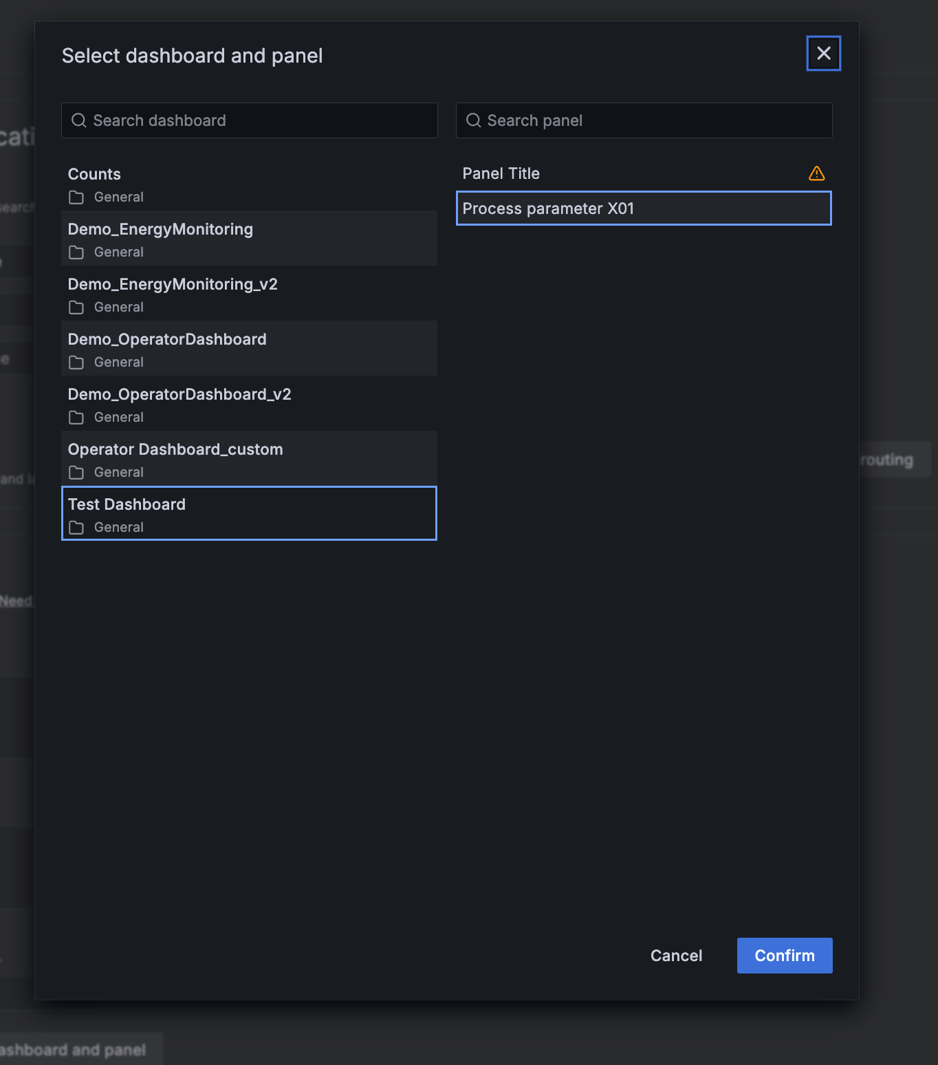 Link the alerts to dashboards and panels, to quickly access monitored data and reduce root cause finding time. The alert timings are then visualized in the linked dashboards.