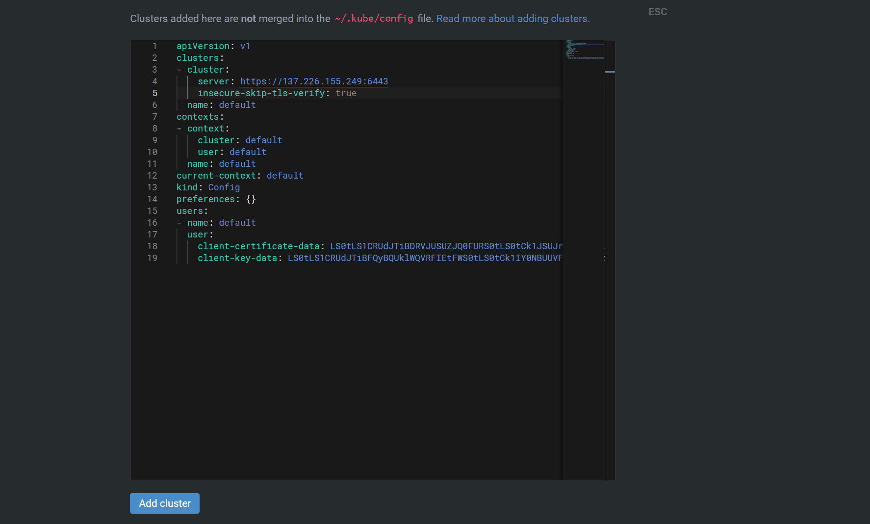 If you get an error like this, you need to add insecure-skip-tls-verify: true to the the cluster and remove the ca certificate, so it looks like the screenshot below.