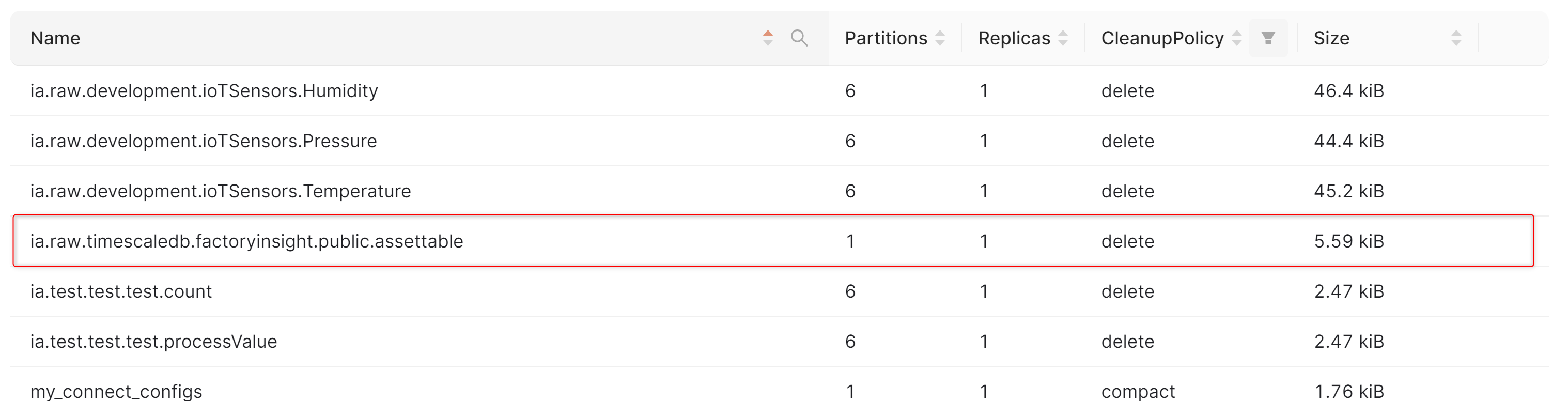 Wait around 5 minutes for everything to set up. After this, you should be able to see your data in the Kafka topic ia.raw.timescaledb.factoryinsight.public.assettable. pen the Redpanda Console (included in the United Manufacturing Hub and accessible via HTTP on port 8090) and select the topic.