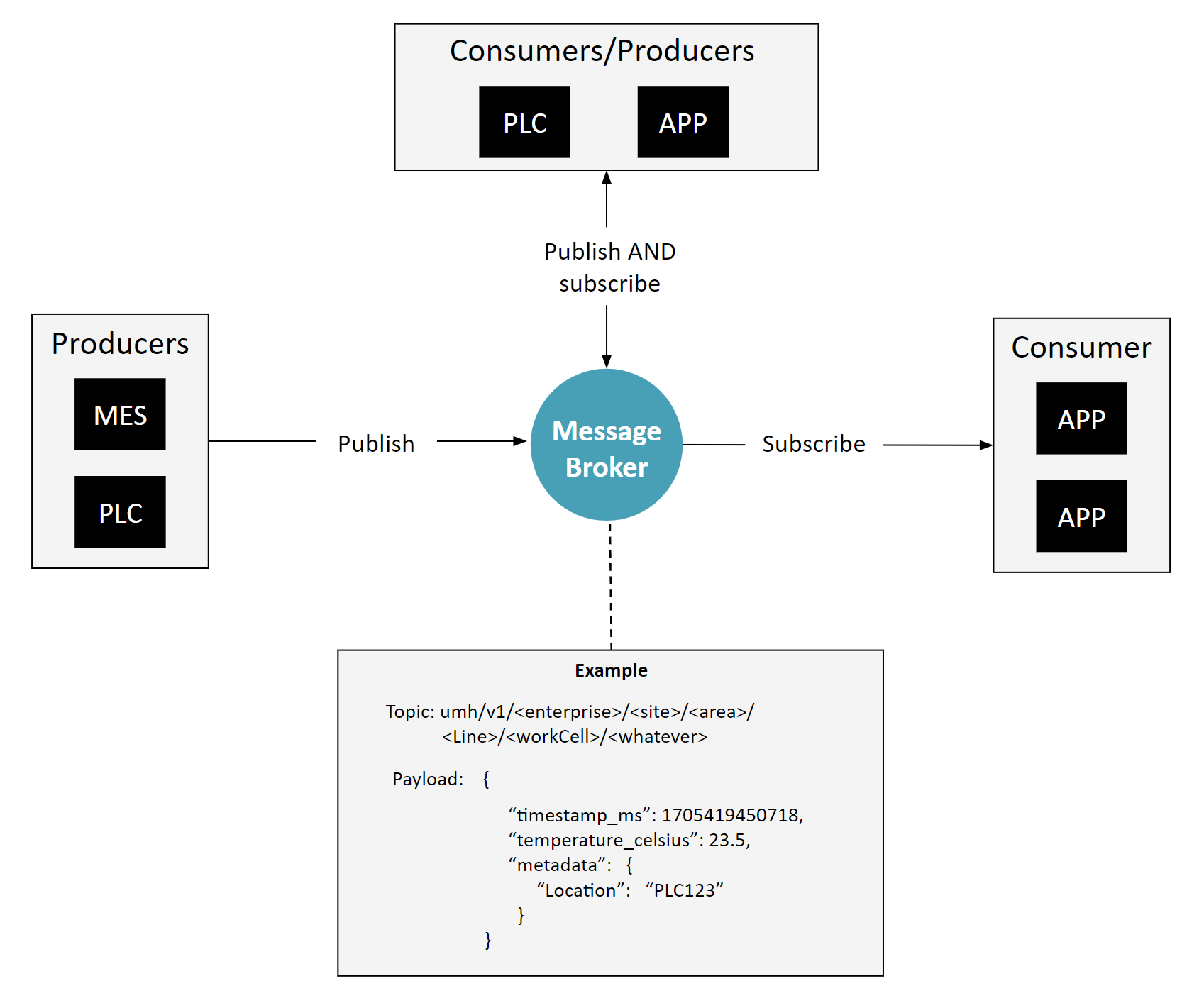 The foundation of a UNS is an Event-Driven Architecture, which facilitates real-time message exchange between multiple entities, referred to as consumers and producers. Central to this architecture is the use of a message broker. In the UNS, almost always people talk about MQTT as the central message broker protocol. There are some commercial vendors out there, which we compared here. In Chapter 3 of this article, we will go through the origins of UNS and go a little bit more into detail of alternatives to Event Driven Architecture here.